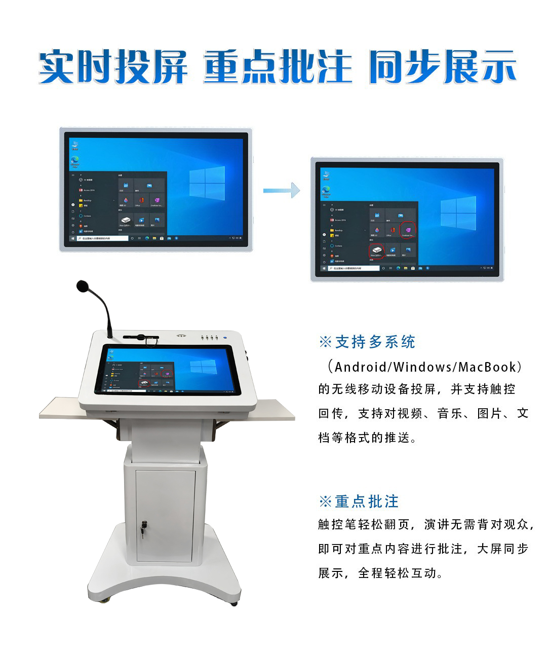 支架设计稳固,可根据演讲者身高和习惯进行灵活调整)麦克风使用:将麦克风插入支架上的接口,调整支架至合适位置,即可开始演讲或授课。